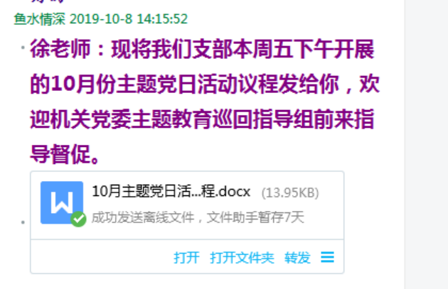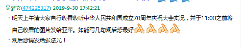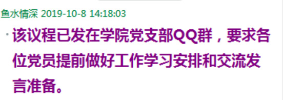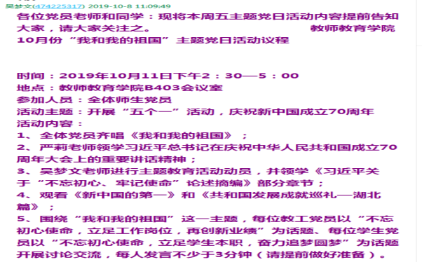 三、抓得紧:为确保活动收到实效,让每一个党员都动起来,支部提前将主题党日活动的通知及活动议程发在支部党员QQ群,要求各位党员知晓“我和我的祖国”支部主题党日活动要求及议程安排,请各位师生党员主动收听收看国庆阅兵和庆祝大会实况,并认真准备主题党日活动发言内容。党员们收到通知后都积极回应,并在群里自发地就《我和我的祖国》伴奏乐的版本选取问题进行了热烈讨论和积极建议。