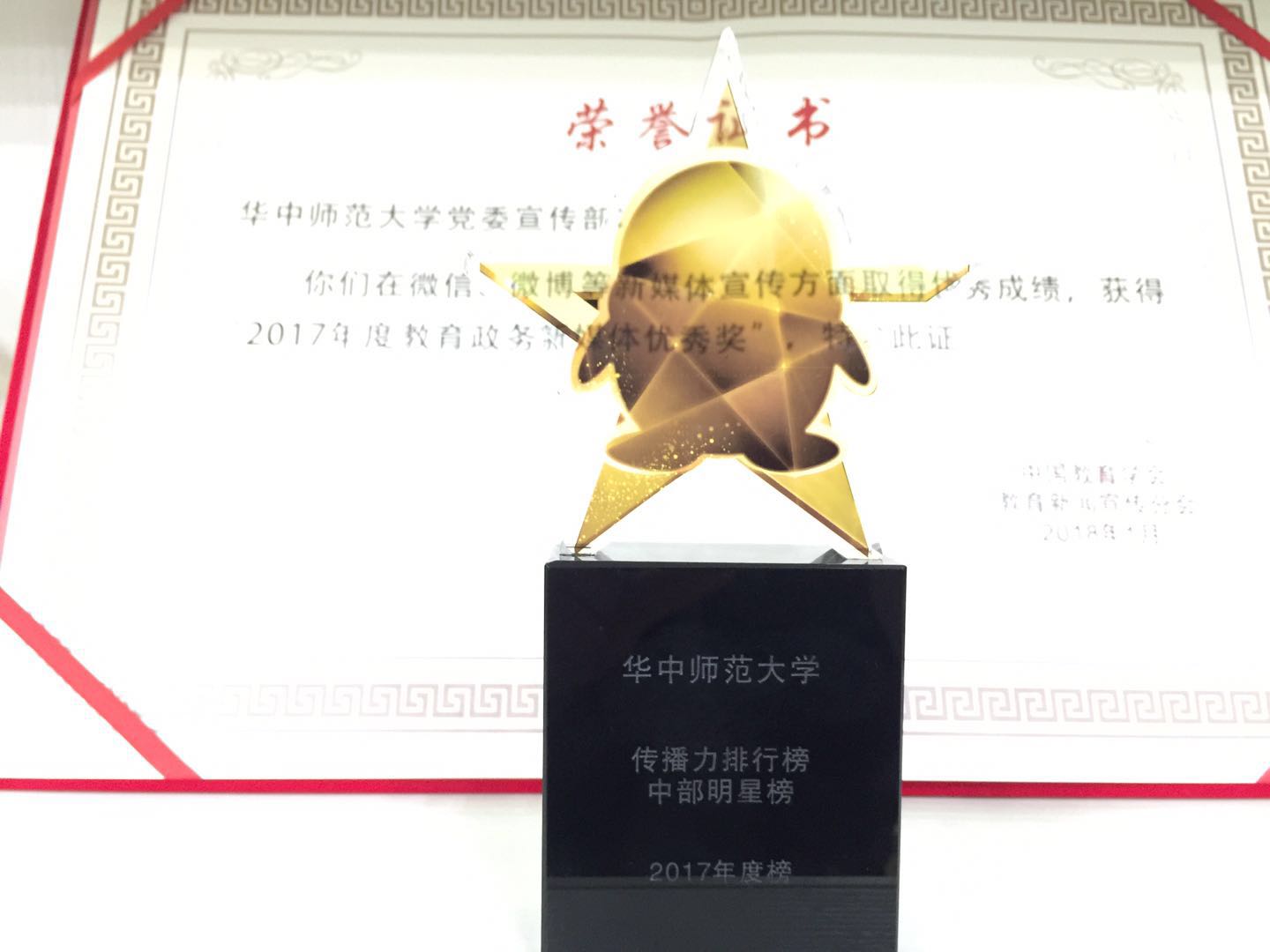 3月8日由武汉大学、腾讯公司联合举办的“络+盛典”—— “中国互联网+校园媒体创新力峰会”在武汉大学举办。我校官方微信荣获“传播力排行榜中部明星”。本次盛典表彰2017年在媒体融合创新发展方面取得突破的杰出媒体代表、最具传播力和创新力的高校新媒介,为国内媒体、互联网行业工作者提供一个高水平的信息交流平台。