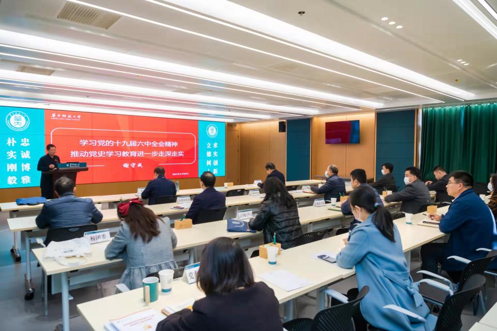 在题为《学习党的十九届六中全会精神推动党史学习教育进一步走深走实》的专题党课中,谢守成从深刻认识十九届六中全会的重大意义、全面把握《决议》的科学内涵和核心要义、贯彻六中全会精神推动党史学习教育走深走实三个层面进行了解读。谢守成表示,在世纪疫情和百年变局相互交织、“两个一百年”奋斗目标相互交汇、中国共产党百年华诞的重要节点,党的十九届六中全会是在重要历史关头召开的一次具有重大历史意义的会议。全会审议通过的《决议》通篇融汇了百年来中国共产党践行为中国人民谋幸福、为中华民族谋复兴的初心使命所进行的奋斗、牺牲和创造,从坚持党的全面领导、全面从严治党、经济建设、全面深化改革开放、政治建设、全面依法治国、文化建设、社会建设、生态文明建设、国防和军队建设、维护国家安全、坚持“一国两制”和推进祖国统一、外交工作13个方面概括新时代发展成就,总结了中国共产党百年奋斗的历史意义和历史经验,深刻揭示了“过去我们为什么能够成功、未来我们怎样才能继续成功”的道理。谢守成还介绍了四川大学、西南财经大学等六所高校的党史学习教育开展经验,鼓舞大家继续加强党的创新理论武装,及时跟进学习党的最新理论,把党史学习教育焕发出来的政治热情转化为学校高质量发展的强大动力。