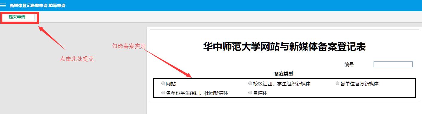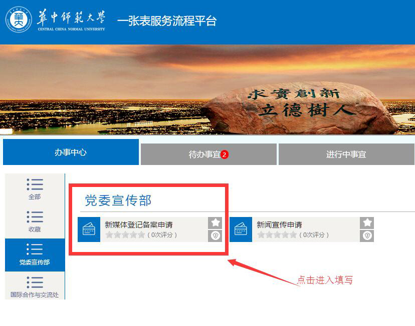 1.新媒体管理员登陆学校信息门户——办事服务大厅,点击进入一张表服务流程平台,选择左边导航“党委宣传部”,点击“新媒体登记备案申请”,选择备案类别,按照要求填写相关内容,点击左上角按钮提交。