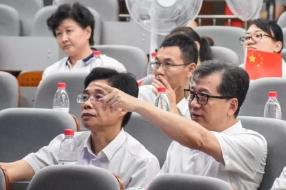 随后,举行南湖综合楼启用仪式。作为唯一一名教师代表,体育学院学术委员会主任王健教授与全体校领导及施工方代表一起上台,共同为新投入使用的华师新地标—南湖综合楼揭牌,这也标志着华中师范大学办学历史上单体投资最多、面积最大、信息化程度最高的教学设施正式启用。