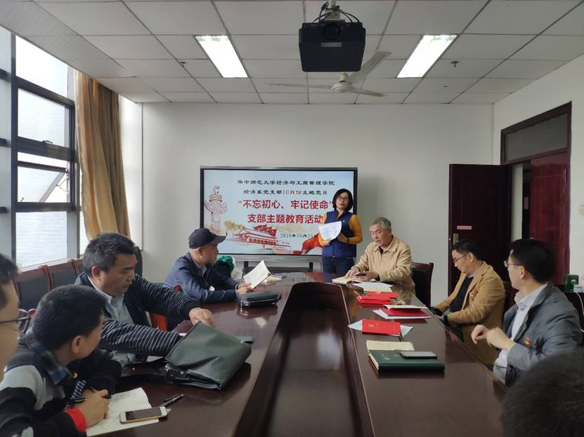 10月25日下午,经济与工商管理学院教工经济系党支部在10号教学楼701会议室开展“不忘初心、牢记使命”十月份支部主题党日与专题研讨活动,全系共计13位党员同志以及3位非党员教师参加,党支部书记肖红蓉同志担任主持人。