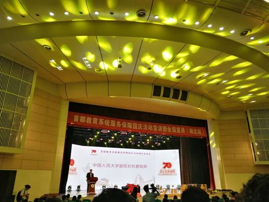 在新中国成立70周年系列庆典活动中,首都教育系统组织9.6万余名师生积极参与各项工作,教育部组织30个由首都高校师生组成的宣讲团奔赴全国高校开展首都教育系统服务保障国庆活动宣讲。11月11日,宣讲团踏访荆楚,走进湖北大学,来自中国人民大学的6位师生代表用亲身参与系列庆祝活动的难忘经历,为到场师生上了一堂生动的思想政治课,经济与工商管理学院2019级41名本科生在辅导员何港带领下赴现场聆听。